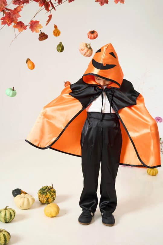 Glugă cu față de dovleac: Gluga portocalie aduce un element distinctiv, fiind decorată cu o față zâmbitoare de dovleac sculptat, un simbol clasic de Halloween, adăugând o notă jucăușă și prietenoasă costumului.