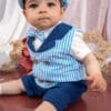 Ansamblul include 5 piese printre care cămașa croită din poplin cu guler, cu nasturi în față și cu mâneci scurte, pantalonii care permit mișcarea liberă a bebelușului, vesta care este piesa de rezistență a costumului la două rânduri de nasturi în două culori cu guler rever oferind ansamblului o notă de eleganță și stil, pantaloni asortați, papion adorabil și șapcă veselă care protejează pielea bebelușului de razele soarelui.
