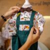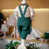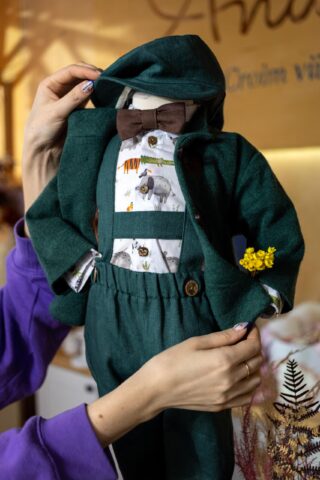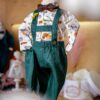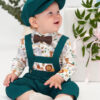 Perfect pentru ocazii deosebite precum botezuri sau petreceri de moț acest costum va ieși în evidență cu bretelele regalbile, nasturii de lemn și aspectul creativ.