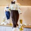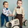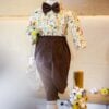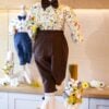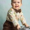 Cămașă din imprimeu vesel junglă bbc 100%. Papionul și pantalonii sunt din textil micropană tip raiat bbc 100%, pantalonii au elasic în talie. Puloverașul este din tricotaj fin cu nasturi din piele ecologică și brandenburguri.