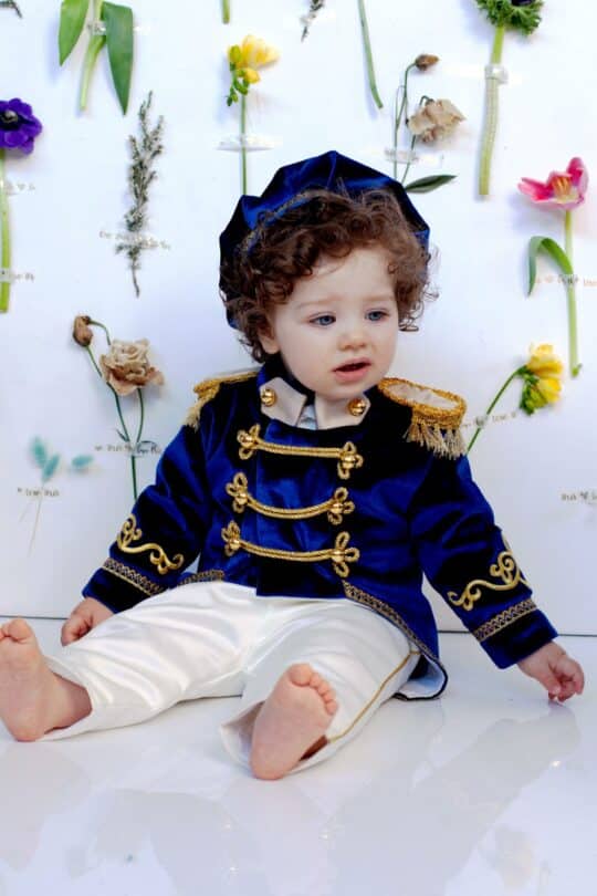 Pășește într-o lume a încântării alături de redingota din catifea albastru regal a micului Nikolai!