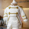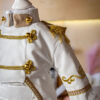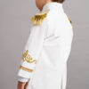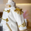 Confecționat cu atenție meticuloasă la detalii, redingota prezintă detalii aurii, epoleți cu ciucuri aurii și un guler special cu o textura diferită, accentuată de nasturi rotunzi aurii.