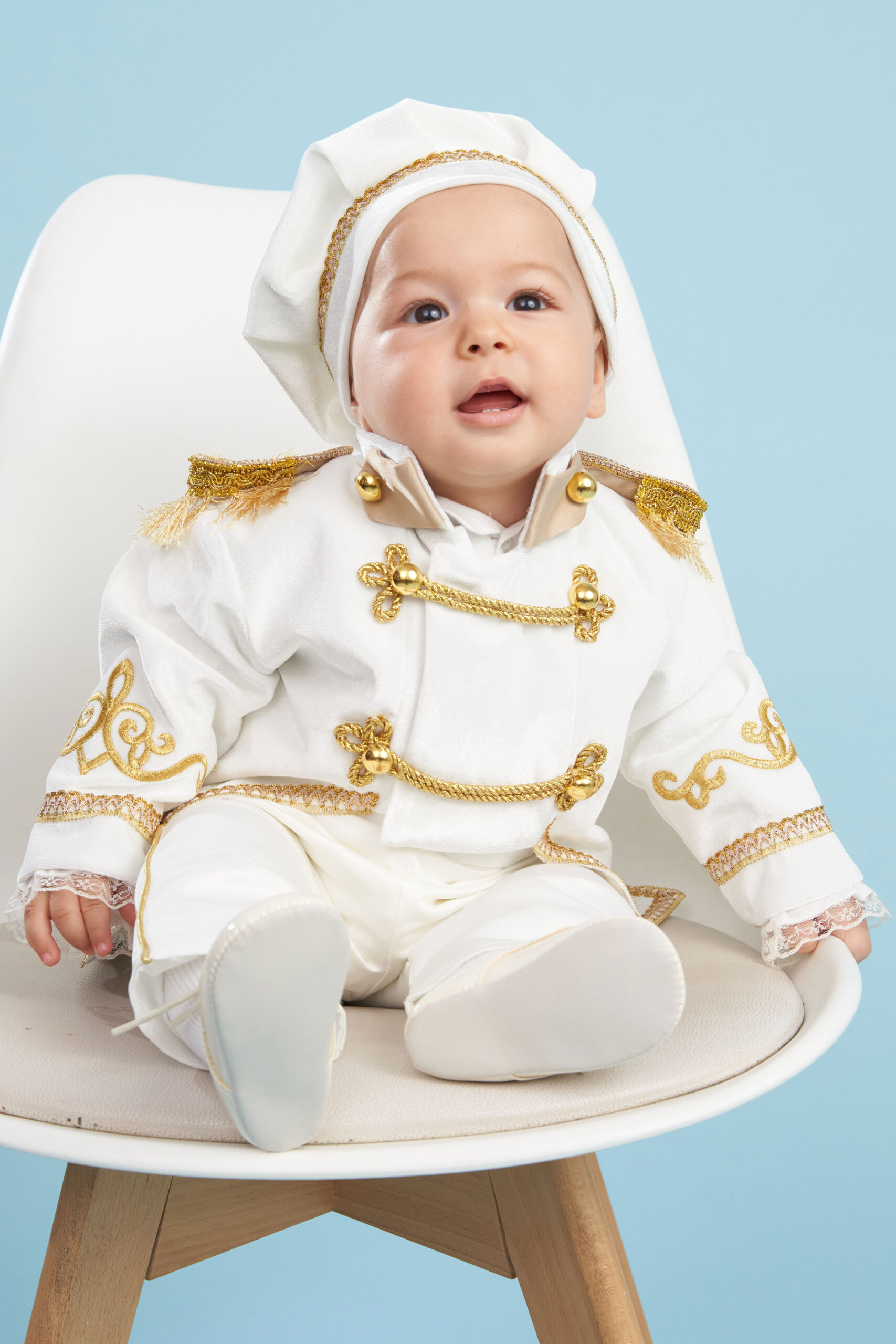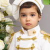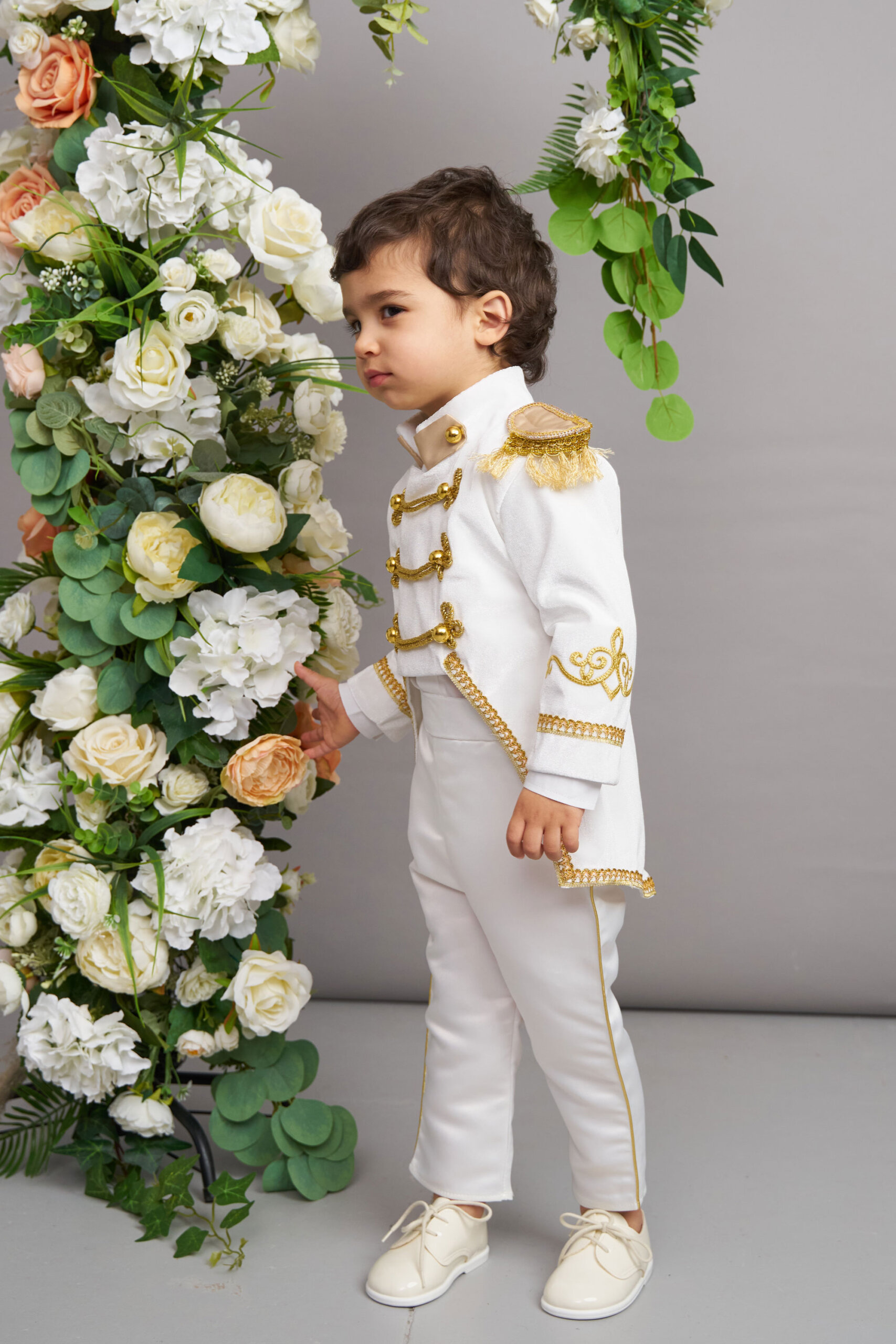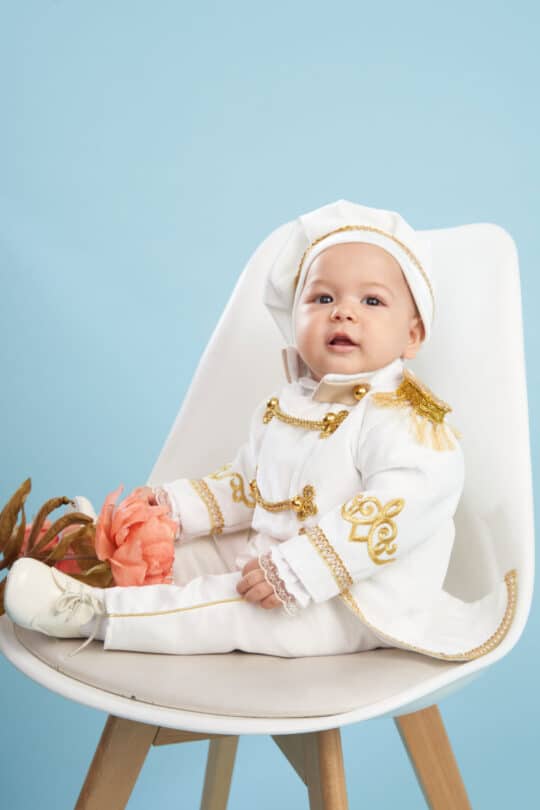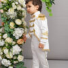 Pășește într-o lume a încântării alături de redingota din catifea ivoire a micului Nikolai!
