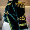 Costum cu redingotă din catifea elegantă de culoarea verde.