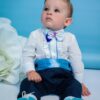 Costumul de botez conține 5 piese: pantaloni (stofă), brâu (satin), sacou (catifea), cămașă (bumbac), papion.