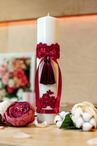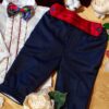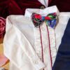 Costumul de botez conține 5 piese: pantaloni (stofă lână), brâu (satin), sacou (catifea), cămașă (bumbac), papion.