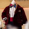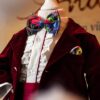 Sacoul din catifea este cambrat, are pense, clape buzunar și buzunar pentru batistă la piept. Cămașa din bumbac 100% are ca detaliu la fentă un jabou scurt, încrețit, conturat de o vipușcă la nuanța sacoului. Pantalonii sunt din stofiță bleumarin fină. Brâul este din satin, este detașabil, se atașează pantalonilor pentru un plus de eleganță.