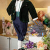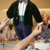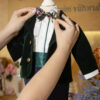 Sacoul din catifea este cambrat, are pense, clape buzunar și buzunar pentru batistă la piept. Cămașa din bumbac 100% are ca detaliu la fentă un jabou scurt, încrețit, conturat de o vipușcă la nuanța sacoului. Pantalonii sunt din stofiță bleumarin fină. Brâul este din satin, este detașabil, se atașează pantalonilor pentru un plus de eleganță.