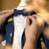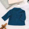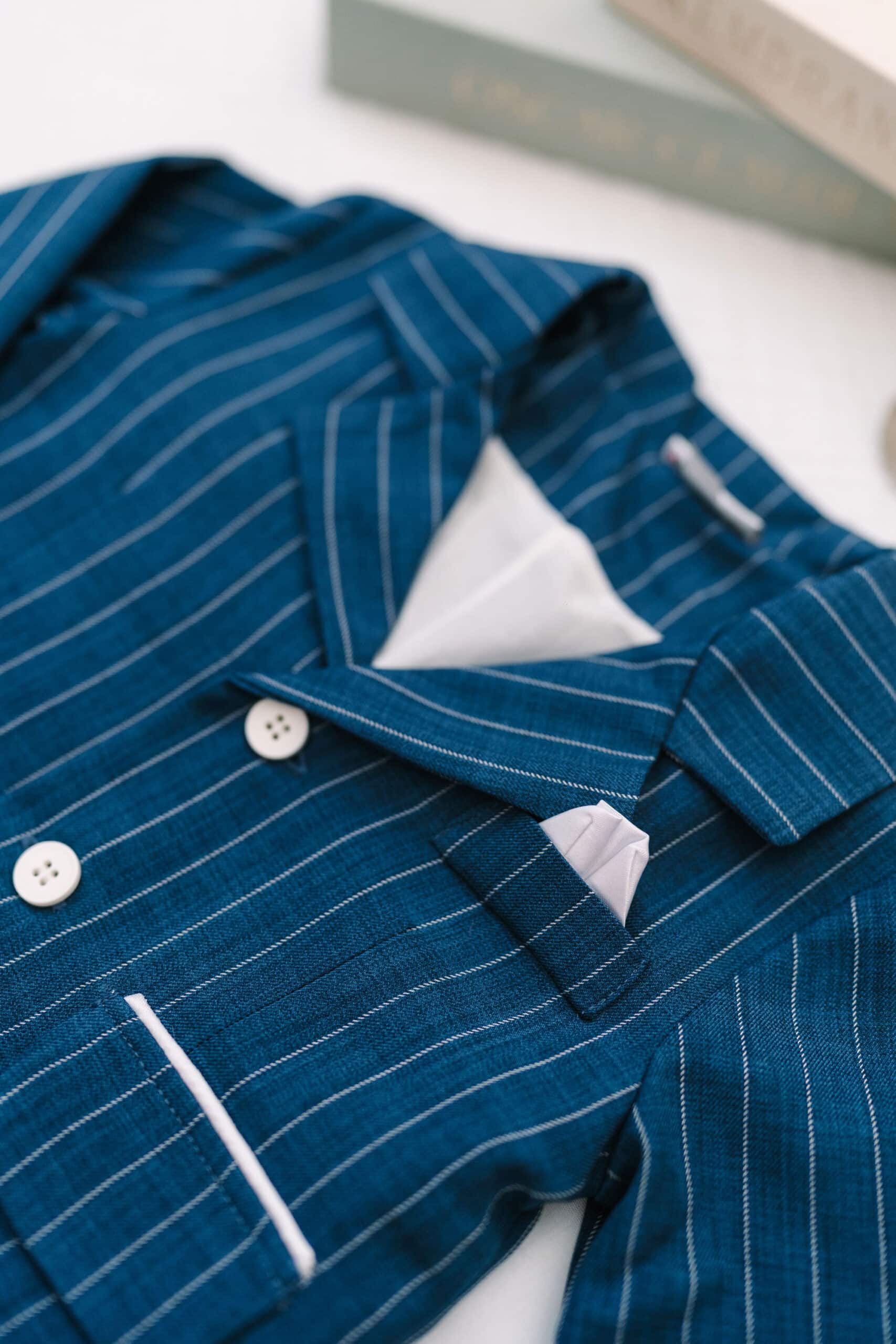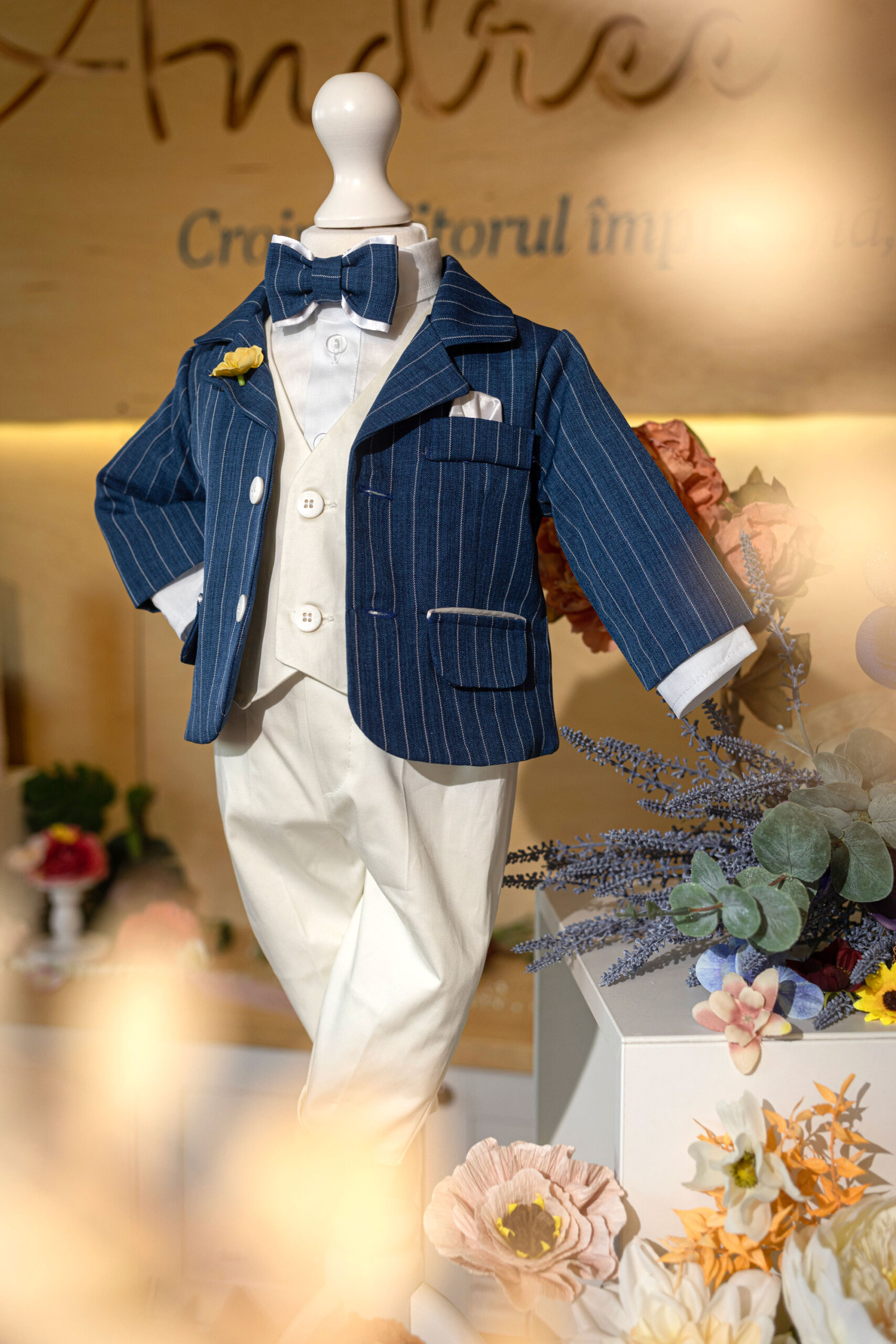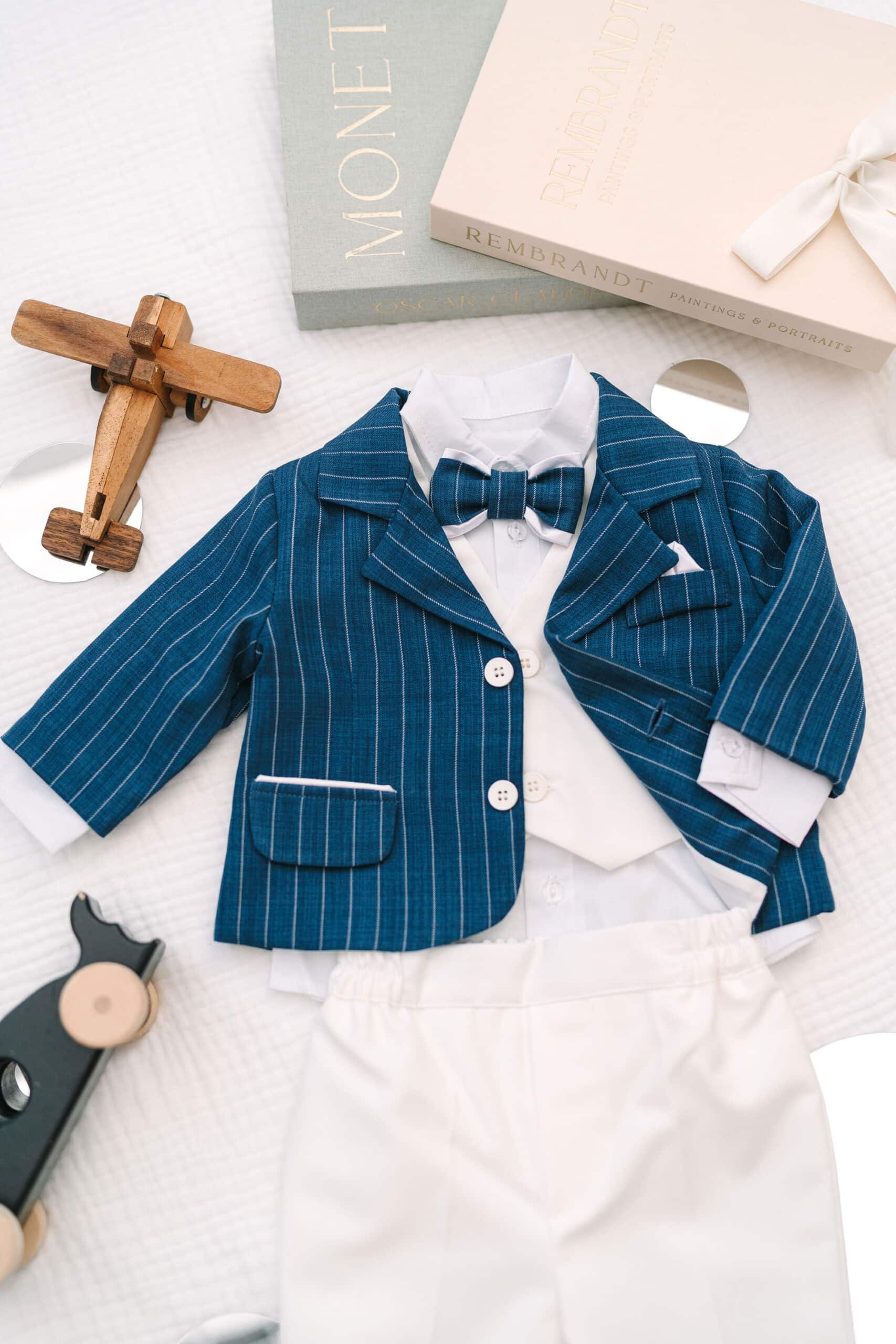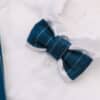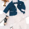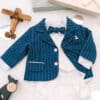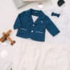- un papion în aceeași nuanță verde de albastru.Detaliile precum nasturii din lemn și accesoriile delicate, precum batista colorată din buzunar, adaugă un aer sofisticat și vesel ținutei.Realizat din materiale de calitate superioară, acest costum oferă și confort, dar și libertate de mișcare, fiind ideal pentru ceremonia botezului.
