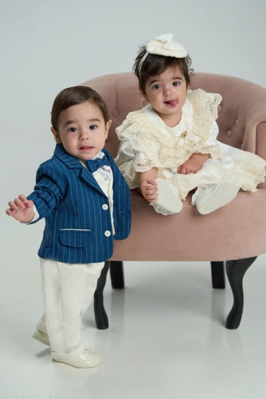Vă prezentăm un model de botez în nuanță vibrantă de albastru petrol, o alegere rafinată și plină de prospețime și modernitate pentru cea mai importantă zi a micuțului tău.