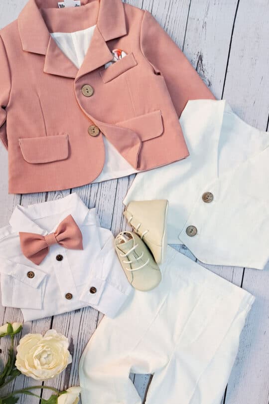 Acest set elegant este format din 5 piese: cămașă, sacou somon deschis cu două buzunare și doi nasturi maro cu croi clasic, vestă ivoire, pantaloni asortați ivoire cu design clasic și elegant și un papion în aceeași nuanță cu sacoul.