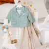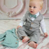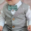 Acest set elegant este format din 5 piese: cămașă, sacou verde mentă, vestă gri subtil, pantaloni asortați gri și un papion în aceeași nuanță verde mentă.