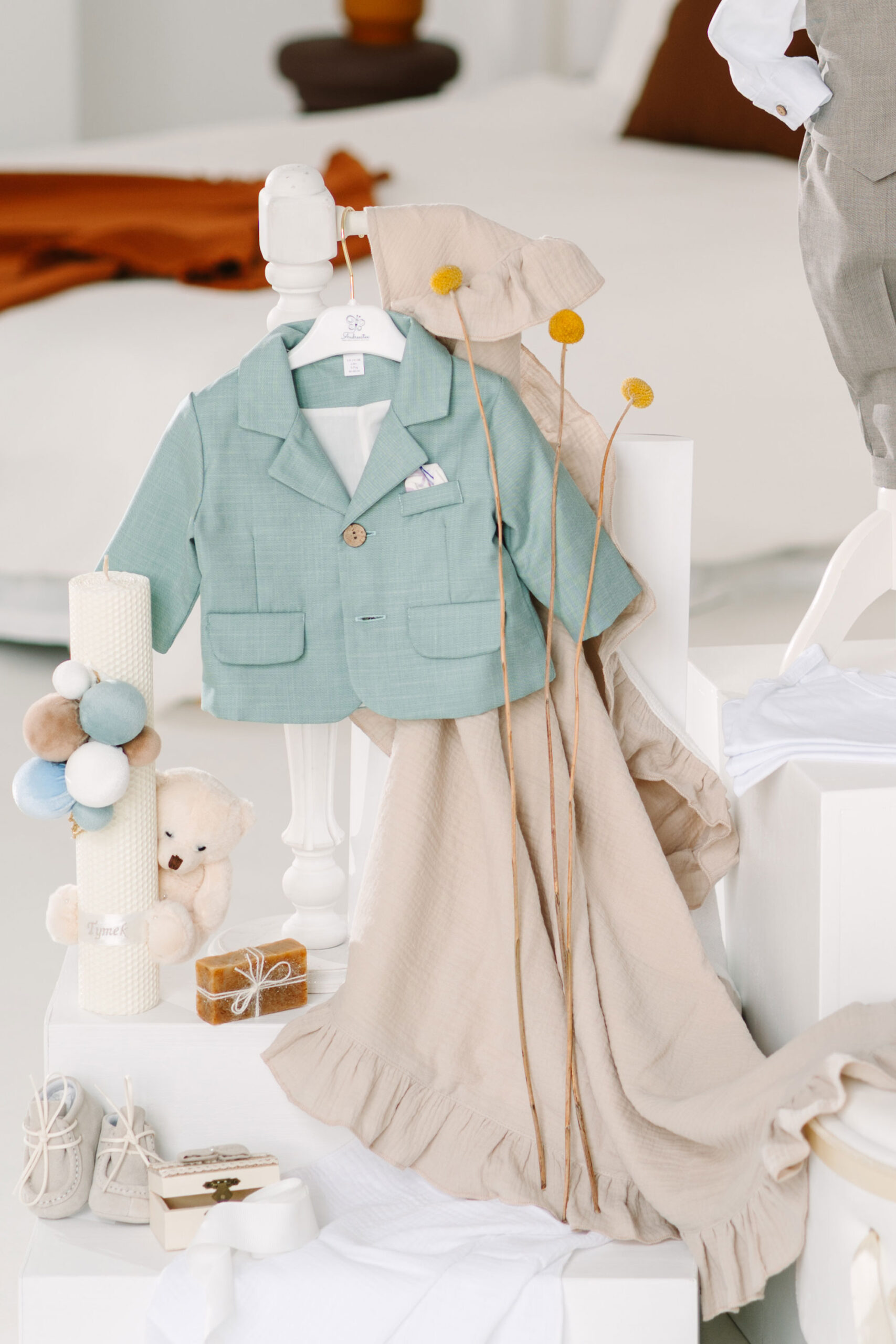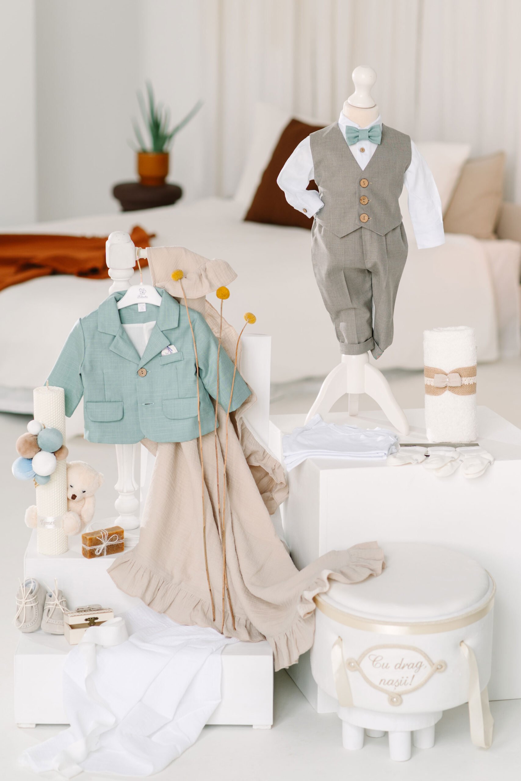 Vă prezentăm un model de botez în nuanță verde mentă, o alegere rafinată și plină de stil pentru cea mai importantă zi a micuțului tău.