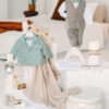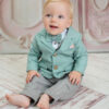 Detaliile precum nasturii din lemn și accesoriile delicate, precum batista colorată din buzunar, adaugă un aer sofisticat și vesel ținutei. Realizat din materiale de calitate superioară, acest costum oferă și confort, dar și libertate de mișcare, fiind ideal pentru ceremonia botezului.