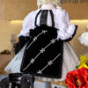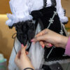 Vestimentația include o frumoasă ie albă cu broderii negre din dantelă pe mâneci și piept, reflectând măiestria și atenția la detalii caracteristice produselor noastre.