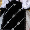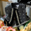 Fota neagră, decorată cu perle albe adaugă un contrast elegant și o notă sofisticată ținutei.