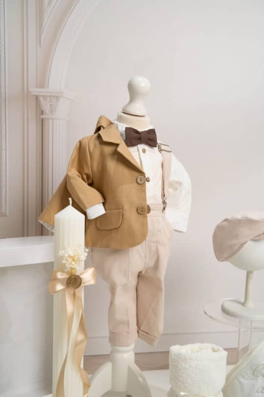 Pantalonii au buzunare, șliț și închidere cu nasture din lemn. Papionul este reglabil cu închizătoare cu arici.