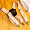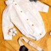 Pantalonii au buzunare, șliț și închidere cu nasture din lemn. Papionul este reglabil cu închizătoare cu arici.