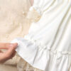 Rochița are un croi clasic, este creață in talie, pe poale are aplicat un volan jucăuș completat de dantela-decor floral.
