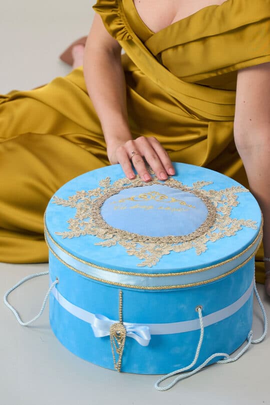 Cutie de catifea, decorată handmade pentru hăinuțe și accesorii botez, cutie transport piese botez.