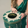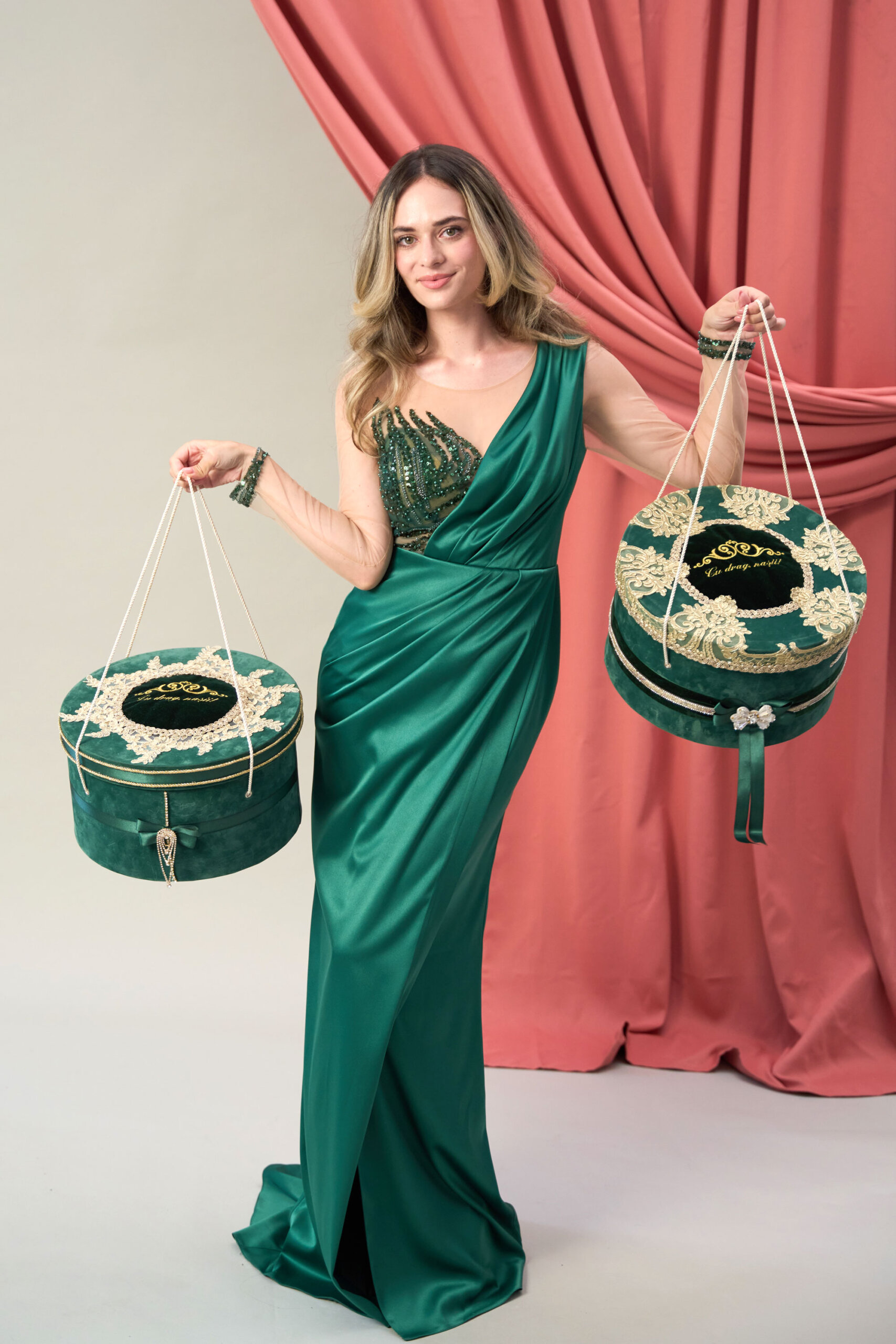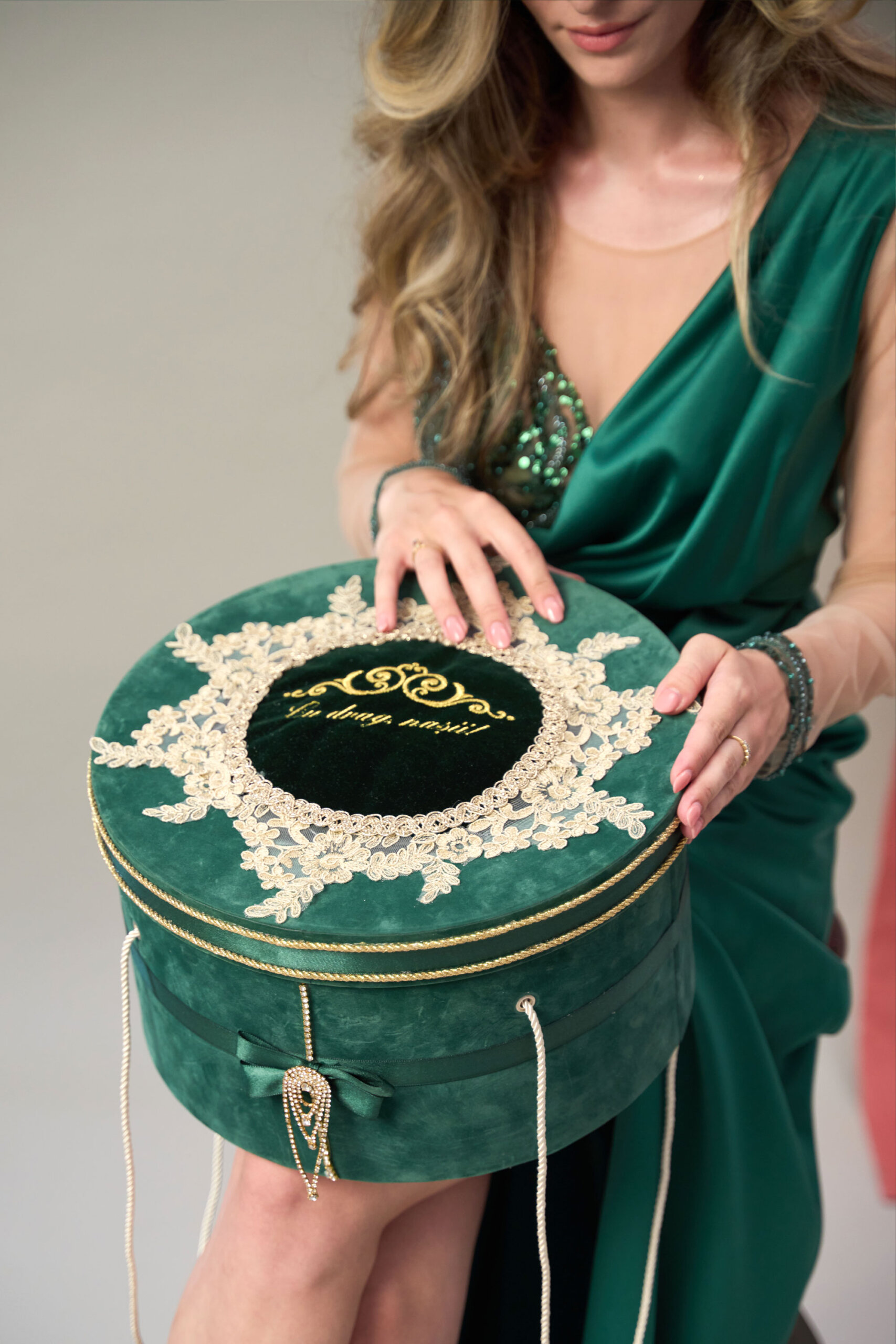 Cutie de catifea, decorată handmade pentru hăinuțe și accesorii botez, cutie transport piese botez.