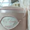 Cufărul este ușor de transportat datorită mânerelor din panglică satinată și se potrivește perfect cu trusourile Andreeatex.