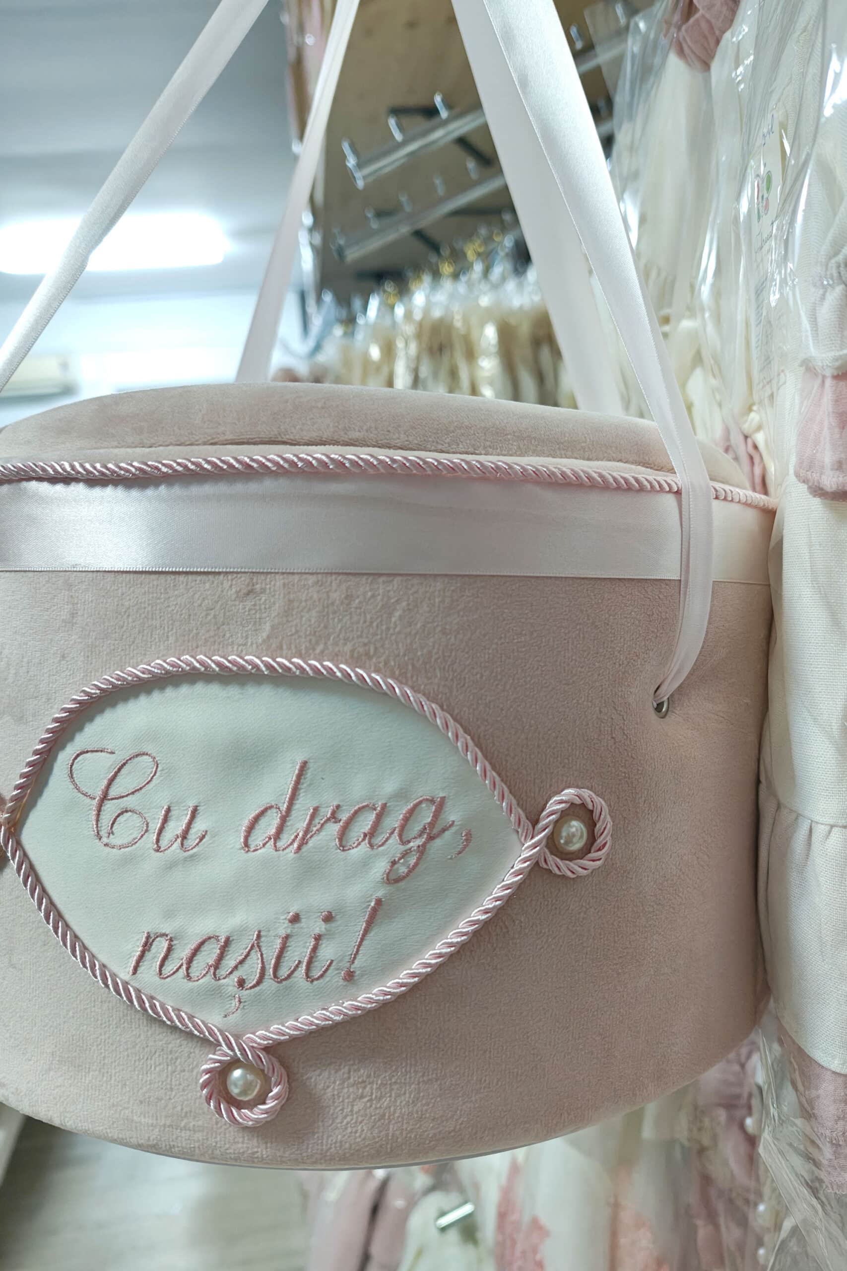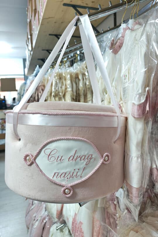 Realizat din catifea pufoasă roz-vintage, acest cufăr buretat este o alegere rafinată pentru părinții și nașii care iubesc simplitatea elegantă.