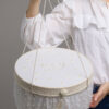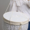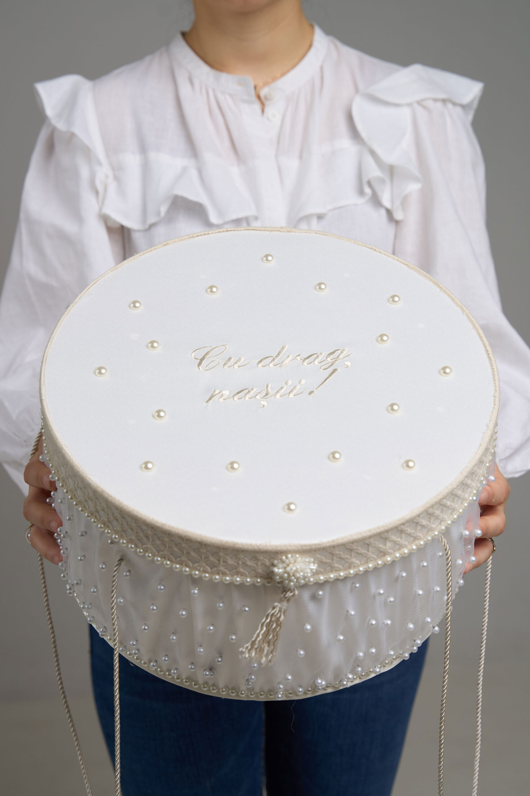 Cutie decorativă, realizată handmade, ideală pentru transportul și organizarea hăinuțelor și accesoriilor de botez. Este decorată cu perle și materiale textile fine, perfectă pentru a completa o ținută de botez elegantă.
