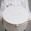 Capacul cutiei poate fi personalizat cu numele copilului și data botezului, înlocuind textul standard „Cu drag, nașii”.