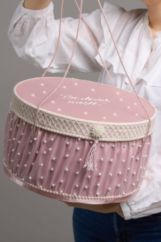 Cutie decorativă, realizată handmade, ideală pentru transportul și organizarea hăinuțelor și accesoriilor de botez. Este decorată cu perle și materiale textile fine, perfectă pentru a completa o ținută de botez elegantă.