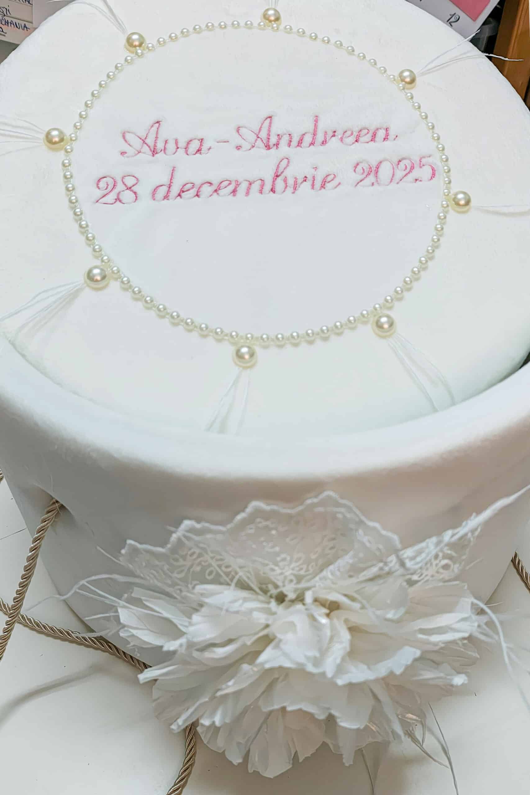Cufăr botez FLOARE buretat din catifea pufoasă – ivoire