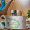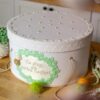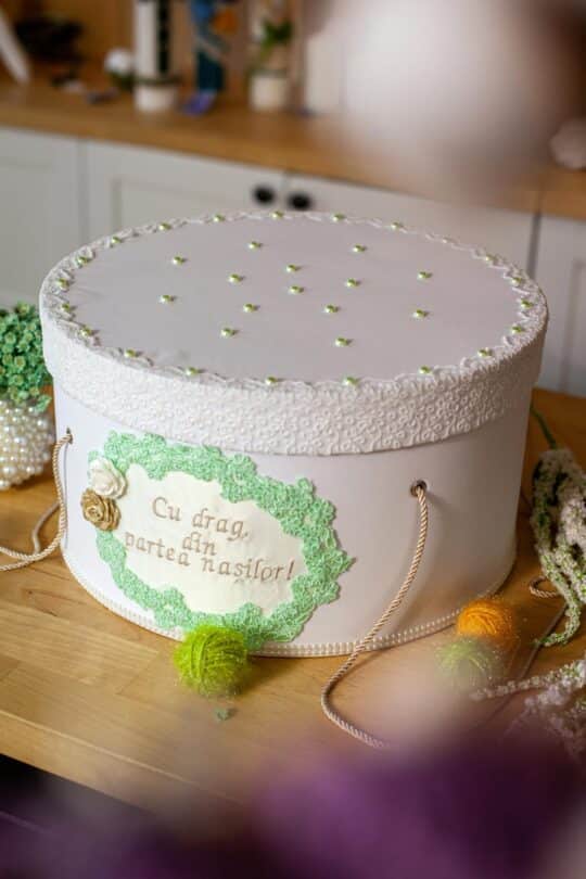 Cutie decorată handmade pentru hăinuțe și accesorii botez, cutie transport piese botez.