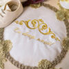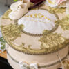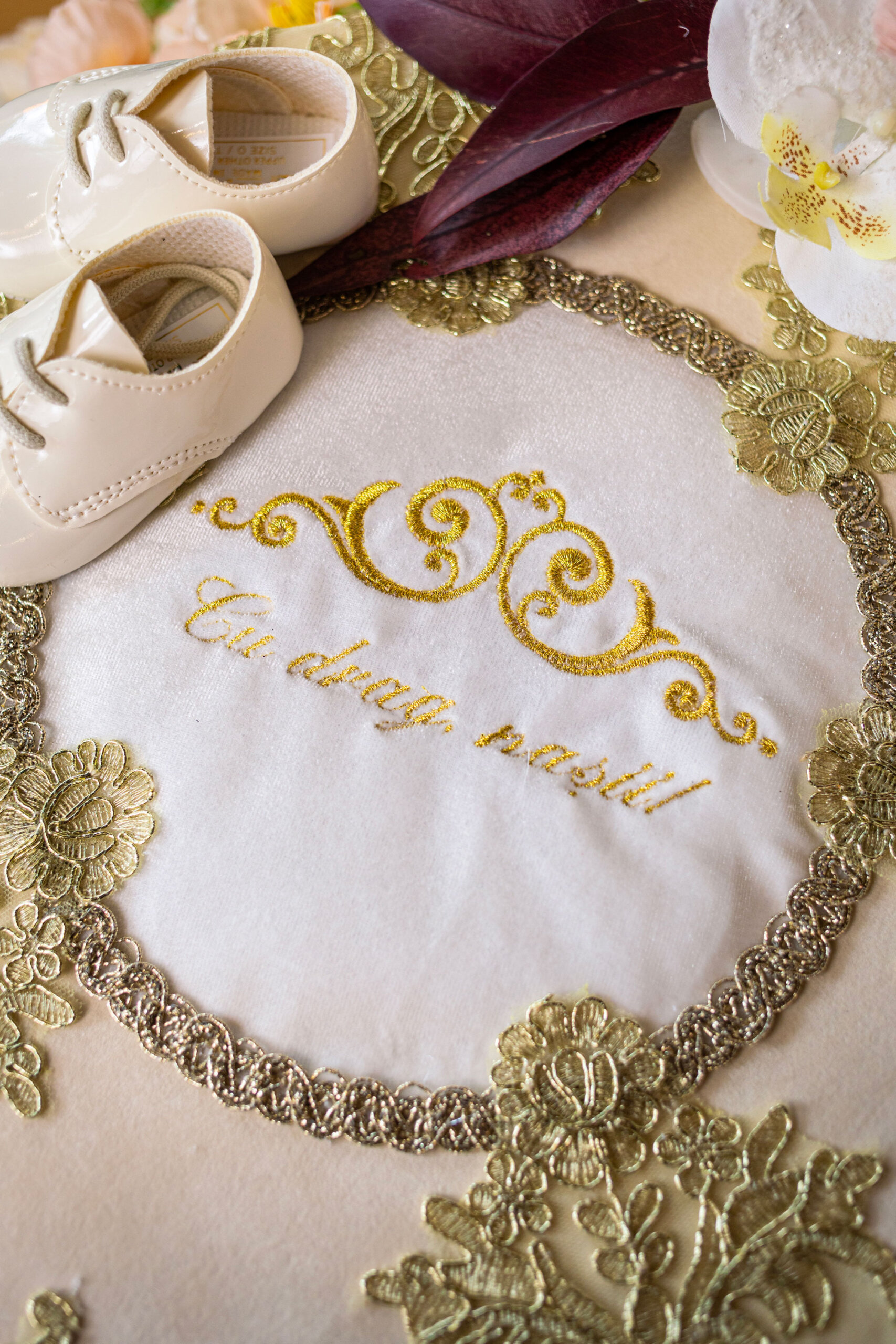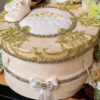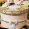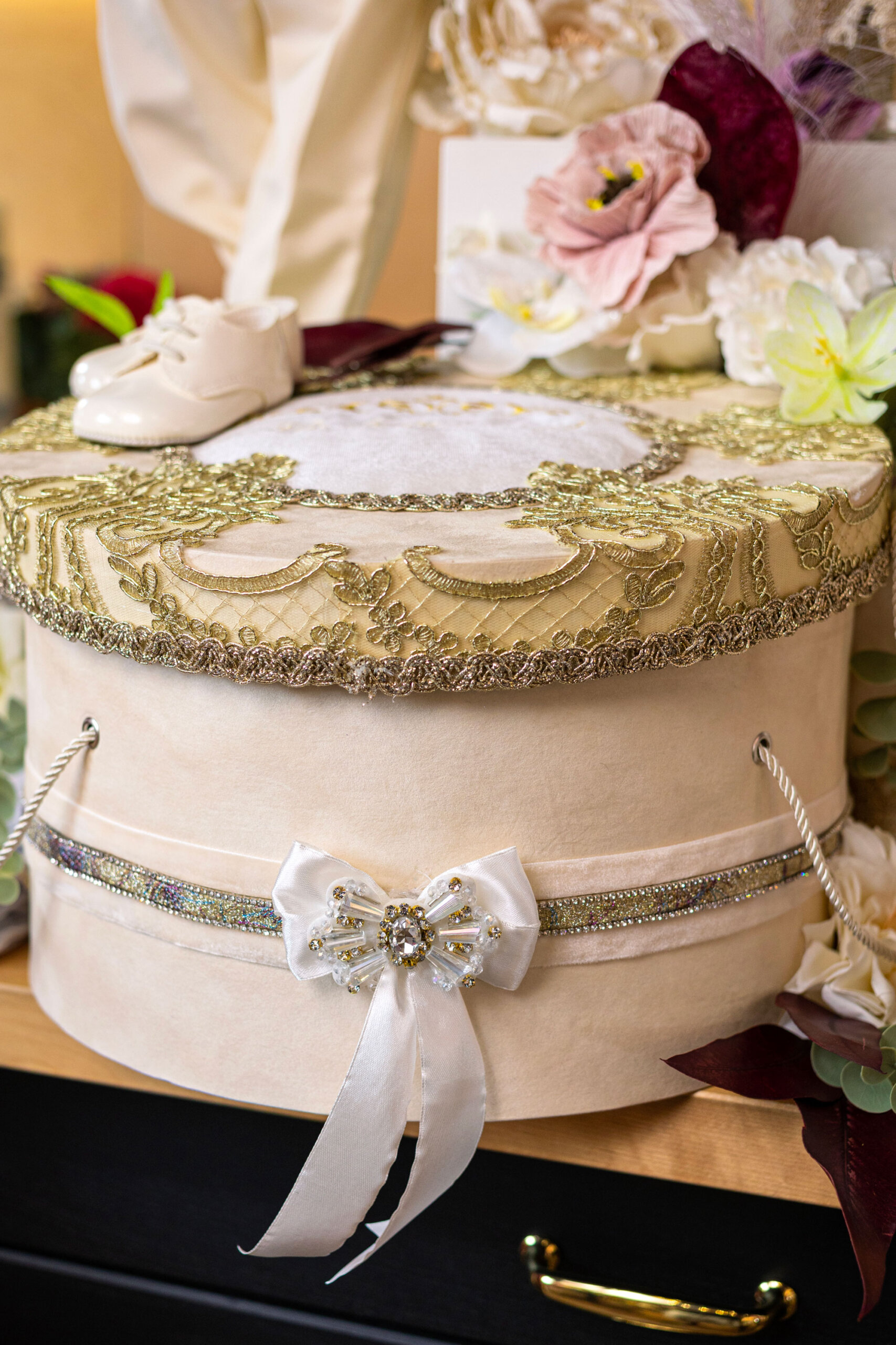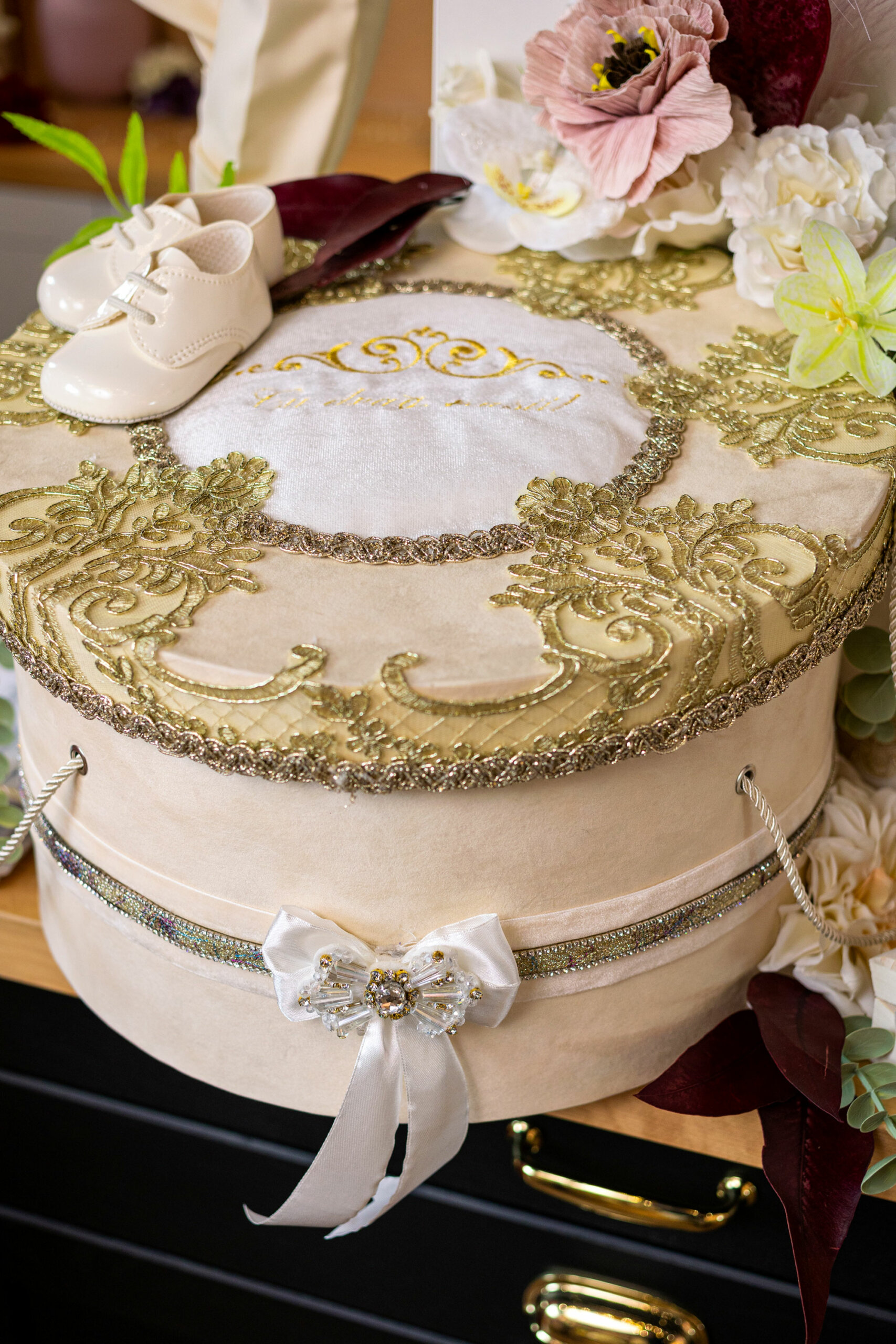 Cutie de catifea, decorată handmade pentru hăinuțe și accesorii botez, cutie transport piese botez.