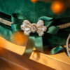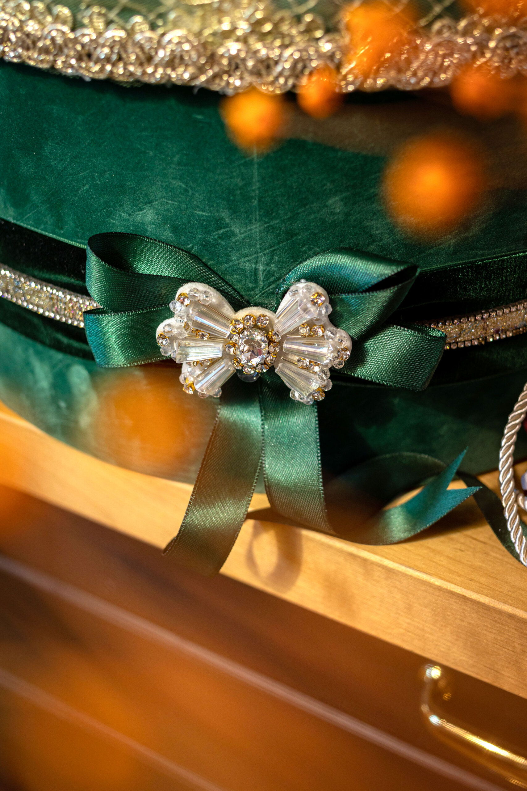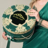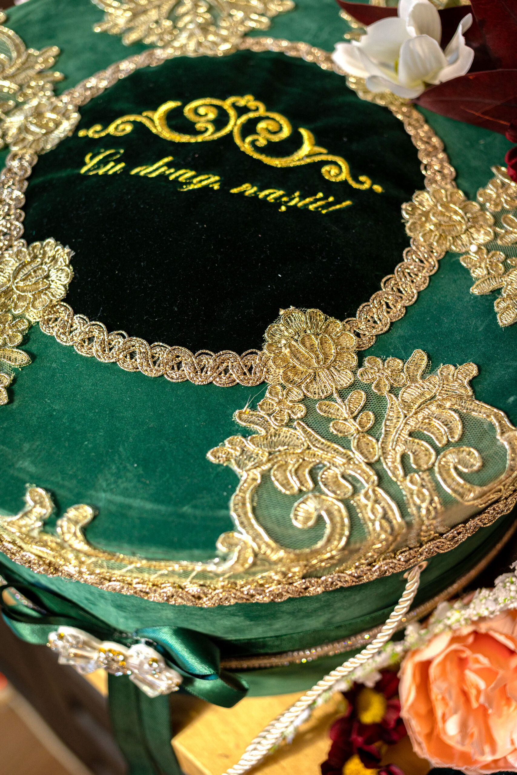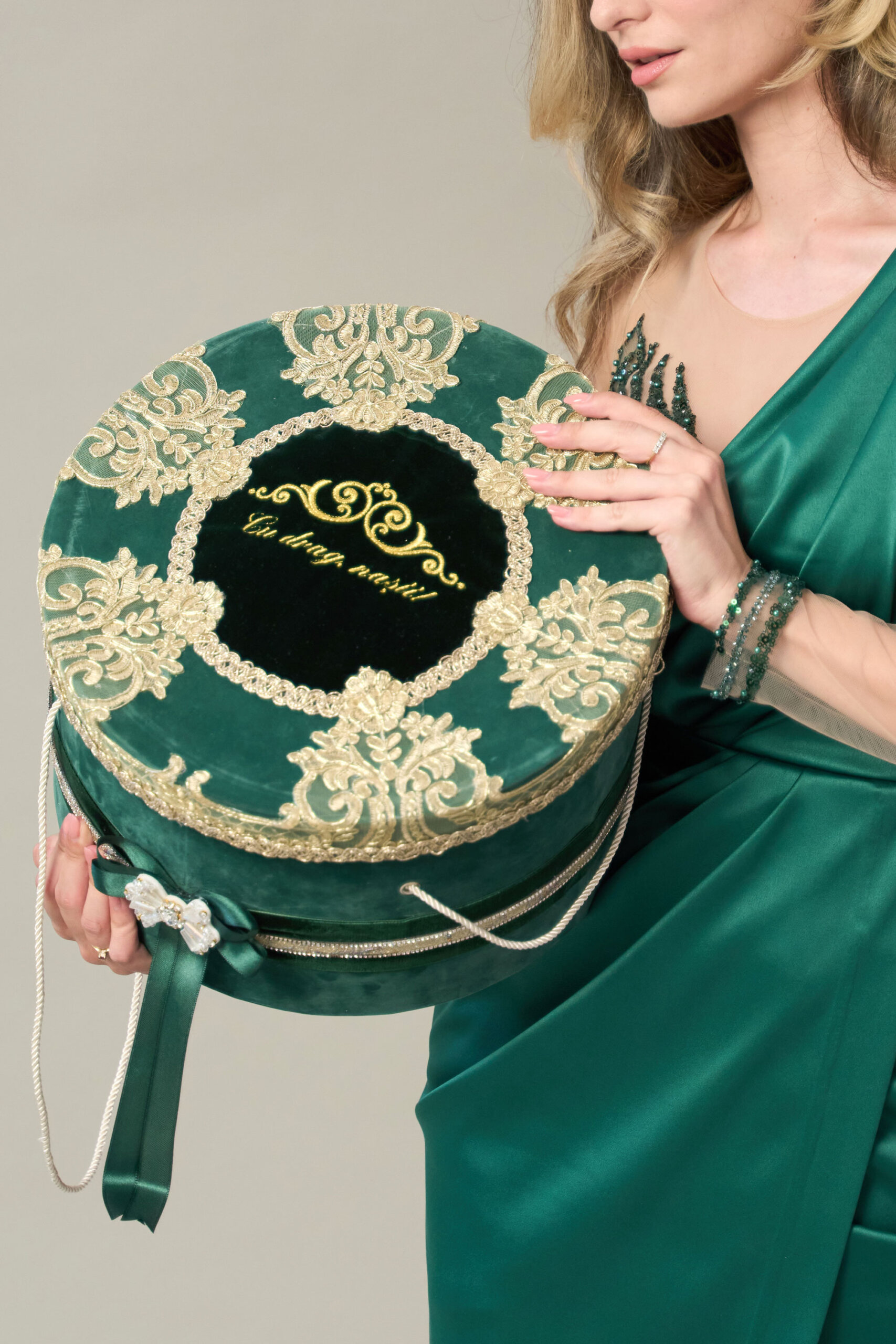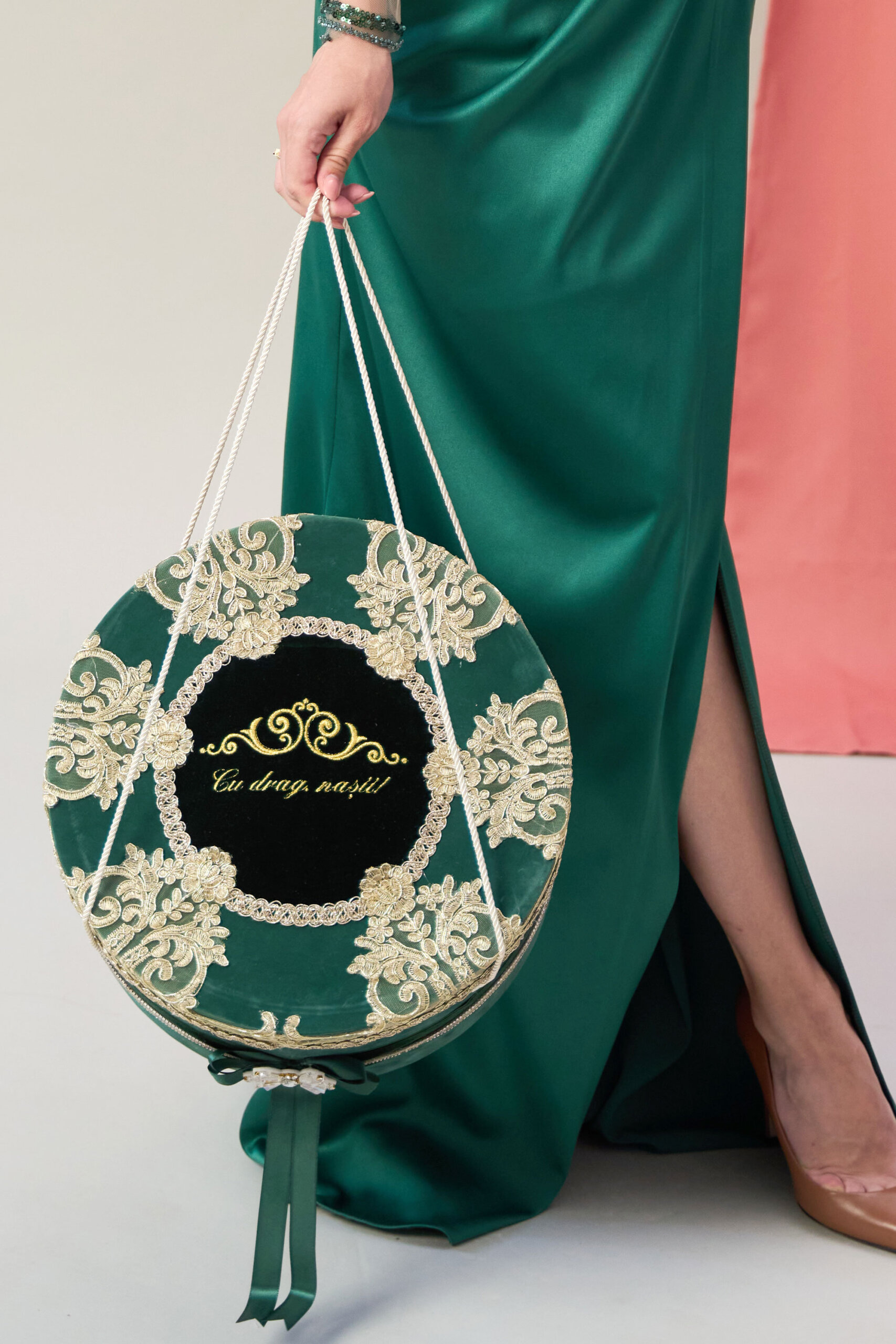 Cutie de catifea, decorată handmade pentru hăinuțe și accesorii botez, cutie transport piese botez.