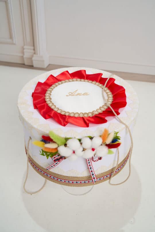 Un cufăr de botez cu detalii tradiționale românești și un aer modern. Decorat cu dantelă, flori textile colorate și motive populare, este perfect pentru un botez cu personalitate.