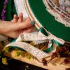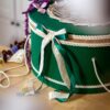 Cufărul vine într-o nuanță vibrantă și intensă de verde, cu animale amuzante și viu colorate conturate de volane de dantelă, funde de satin, benzi de dantelă.