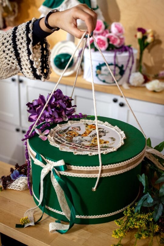 Cutie decorată handmade pentru hăinuțe și accesorii botez, cutie transport piese botez.