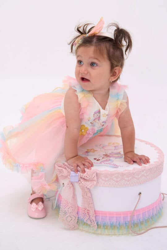 Cufărul vine într-o nuanță vibrantă și intensă, cu unicorn viu colorat, iar cutia este conturate de volane de satin degrade in nuantele unicornului, funde de satin, benzi de dantelă.