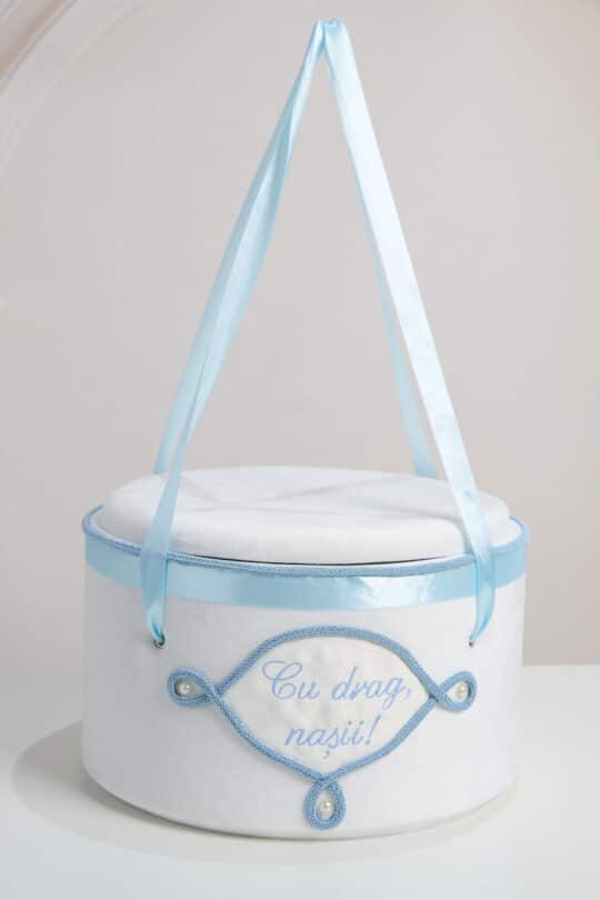 Decorul discret – panglici satinate și șnur împletit în tonuri plăcute – adaugă o notă de gingășie fără a încărca vizual.