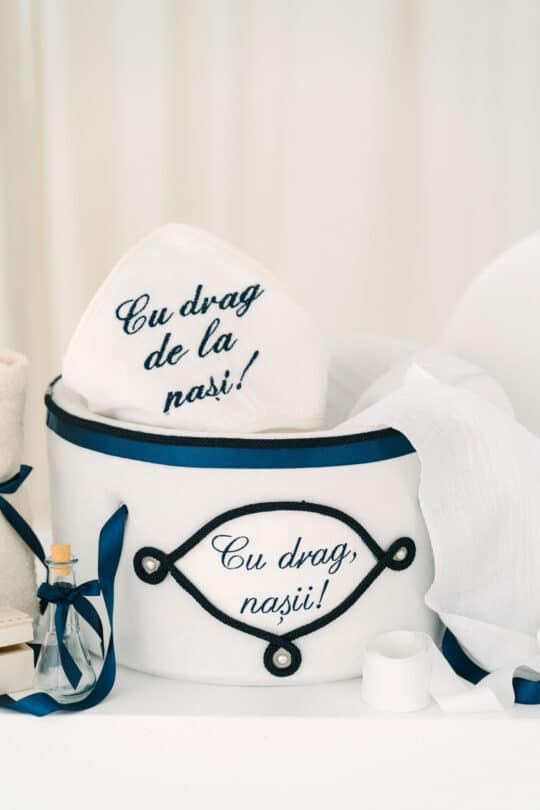 Decorul discret – panglici satinate și șnur împletit în tonuri plăcute – adaugă o notă de gingășie fără a încărca vizual.