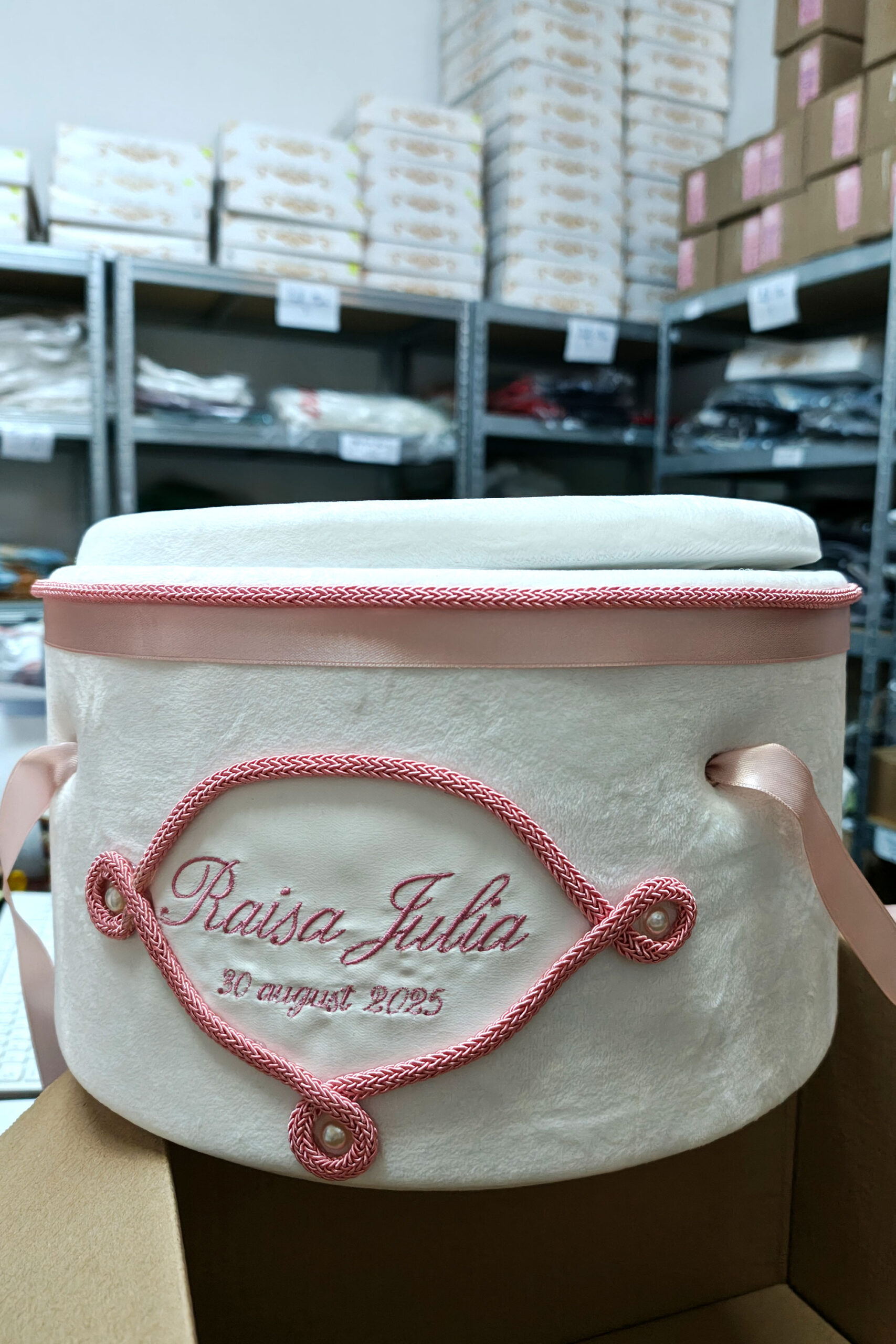 Realizat din catifea pufoasă ivoire, acest cufăr buretat este o alegere rafinată pentru părinții și nașii care iubesc simplitatea elegantă.