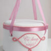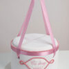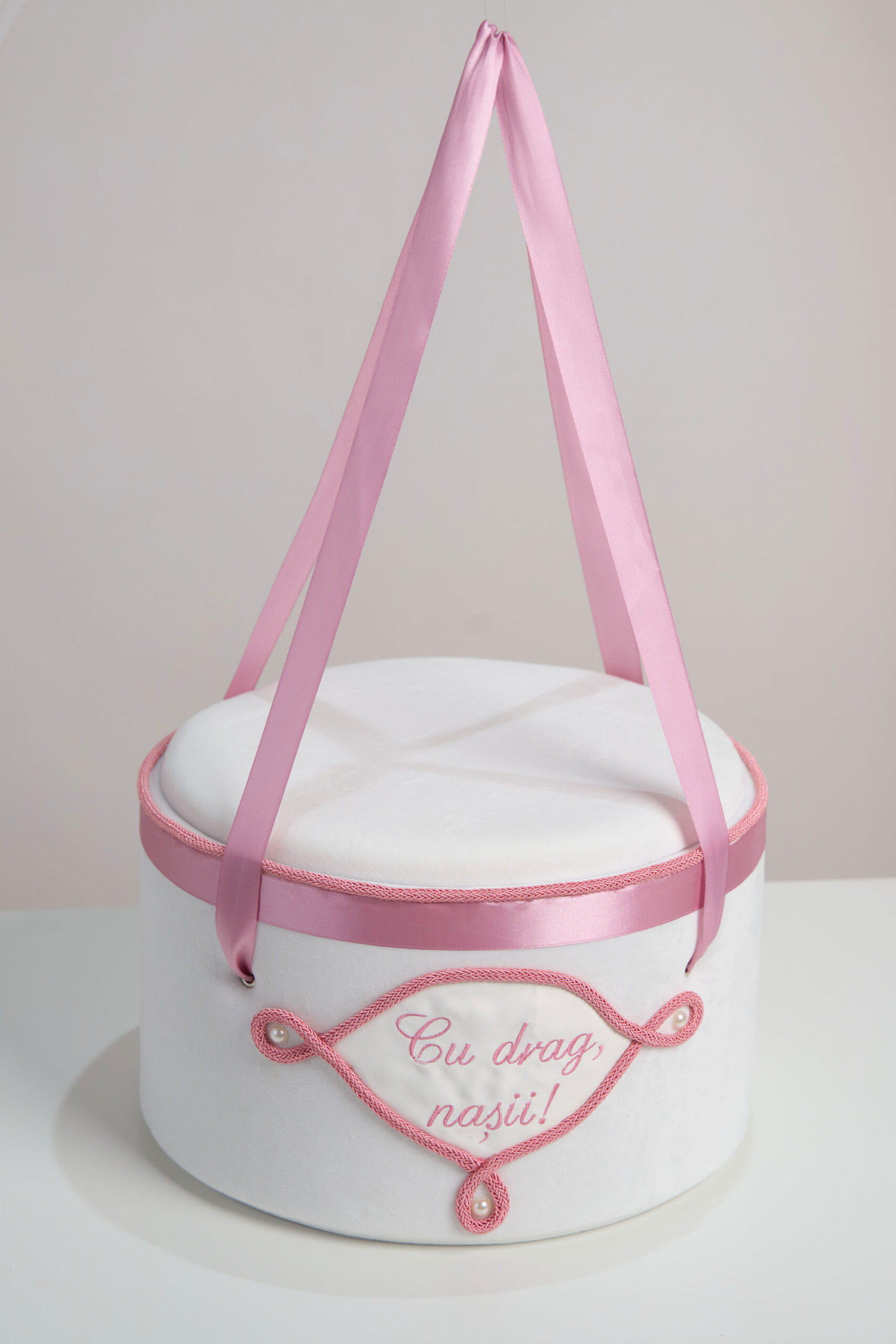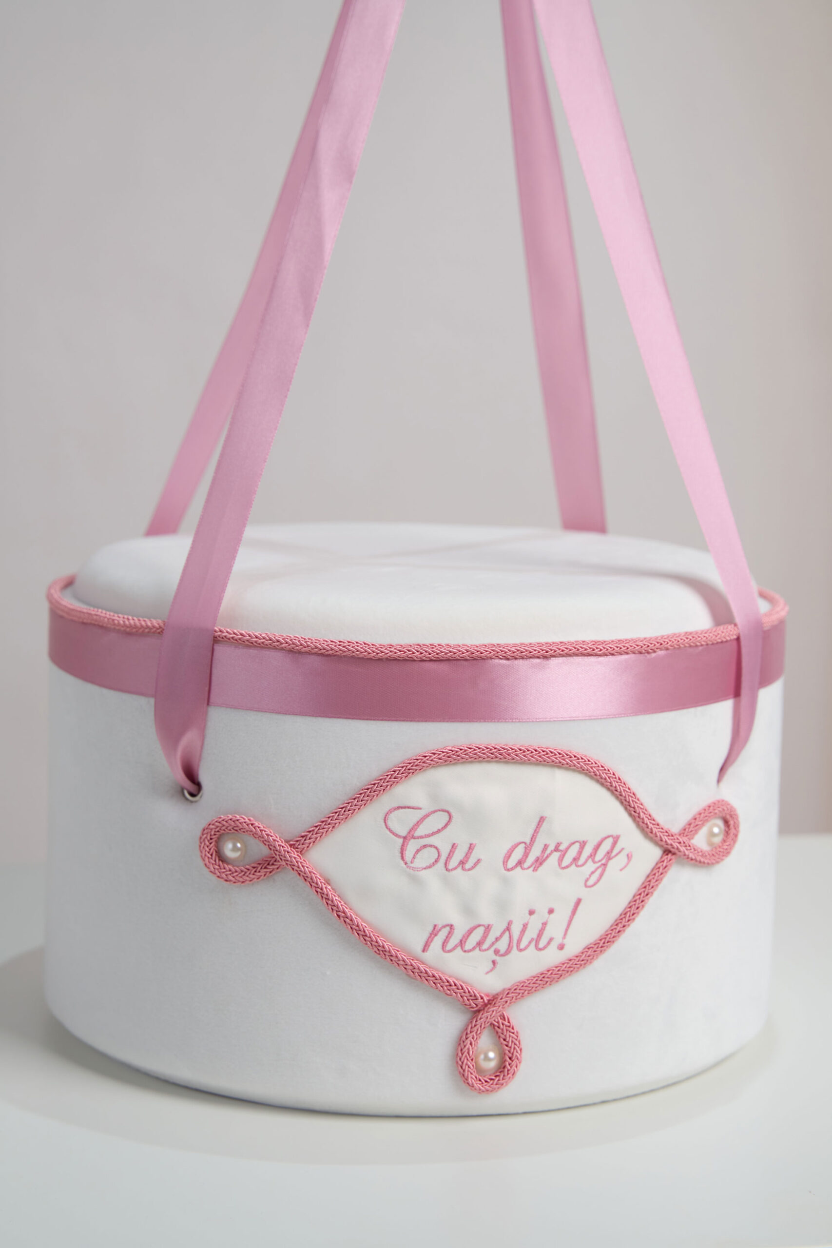 Decorul discret – panglici satinate și șnur împletit în tonuri plăcute – adaugă o notă de gingășie fără a încărca vizual.