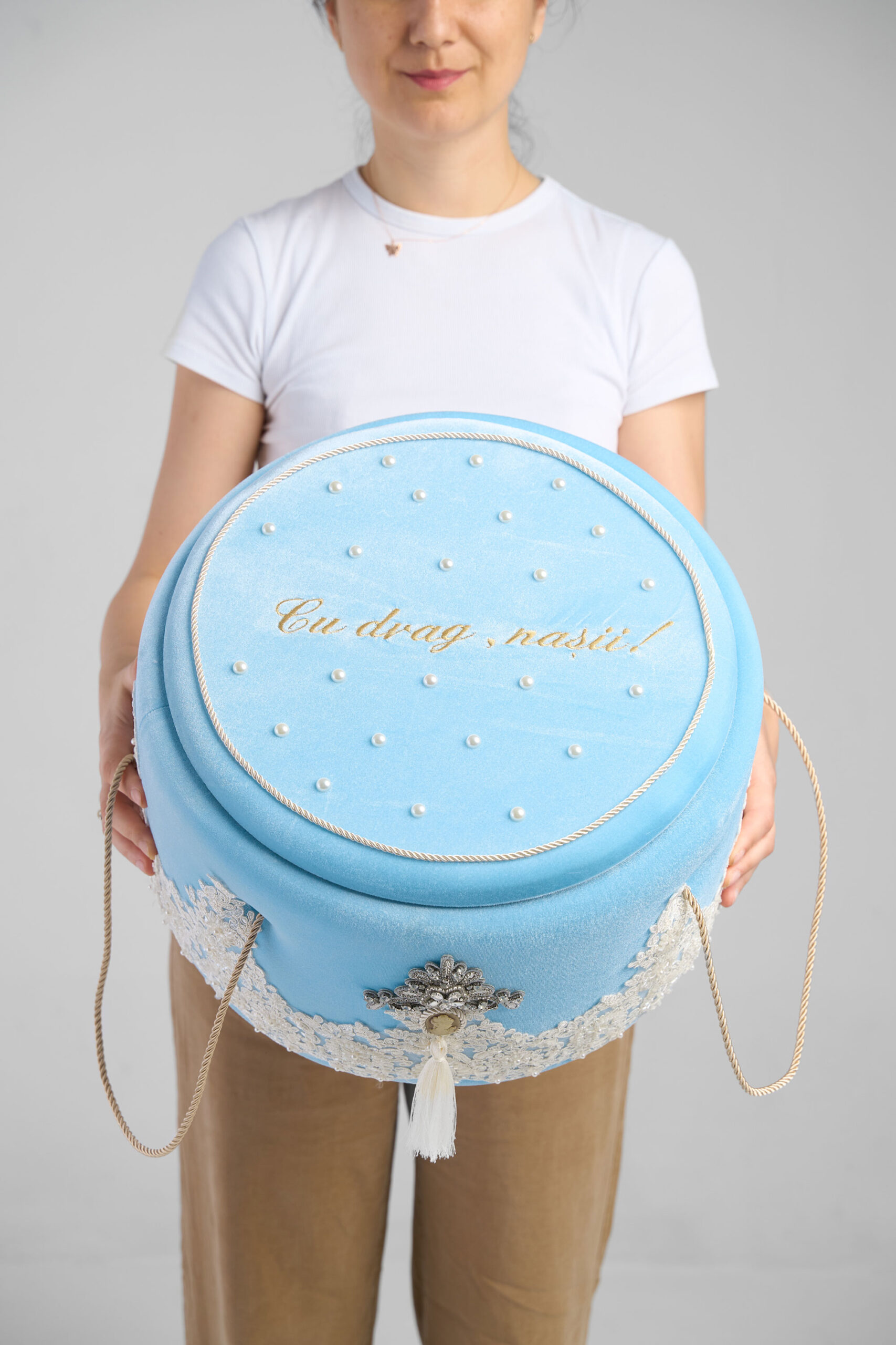 Cufăr Catifea Bleu Botez – Dimensiune XXL, Model Deluxe Capitonat