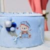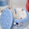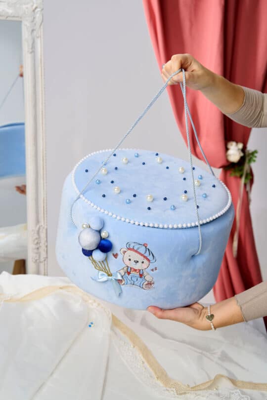 Cufărul are central un ursuleț broderie, ursulețul are decor de baloane și capacul este decorat cu perle colorate la nuanță dispuse armonios pe capac, completând designul cu un aer jucăuș și festiv.