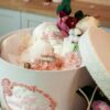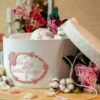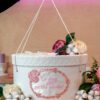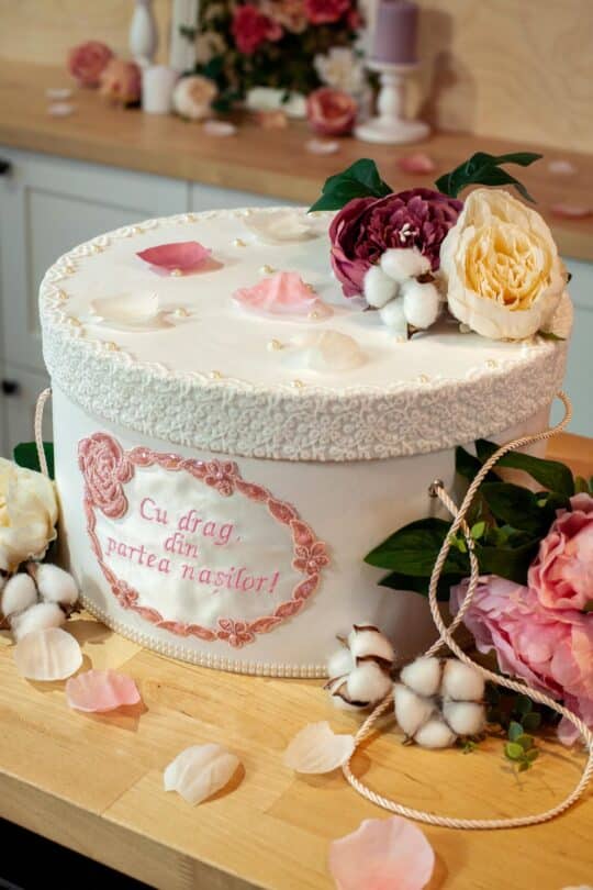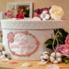 Cutie decorată handmade pentru hăinuțe și accesorii botez, cutie transport piese botez.