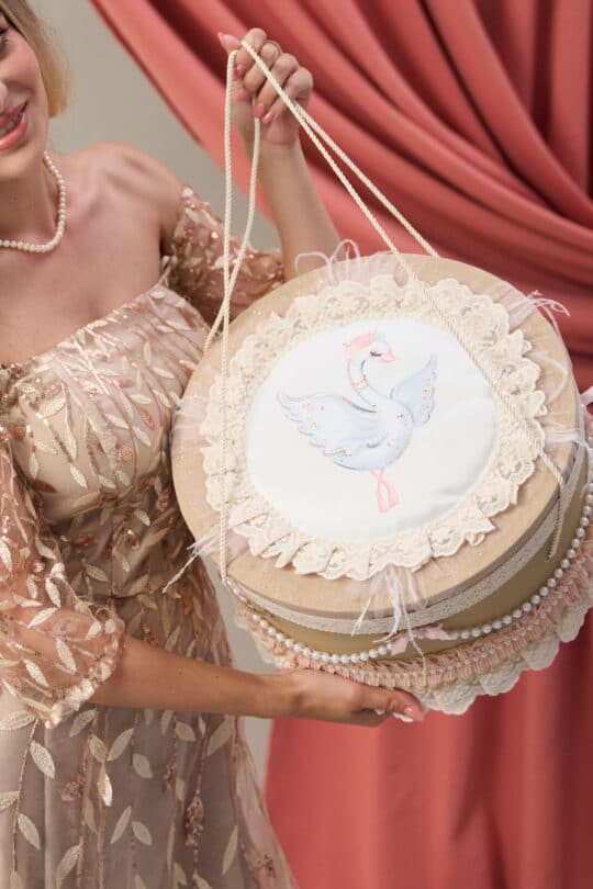 Cutie decorată handmade cu lebădă, perfectă pentru transportul hăinuțelor și accesoriilor de botez, elegantă și rafinată, perfectă pentru evenimente deosebite.