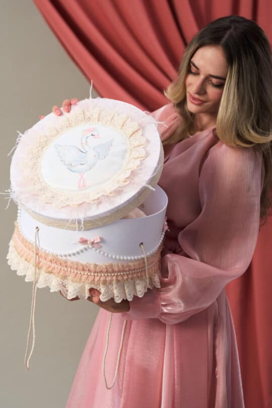Cutie decorată handmade cu lebădă, perfectă pentru transportul hăinuțelor și accesoriilor de botez, elegantă și rafinată, perfectă pentru evenimente deosebite.