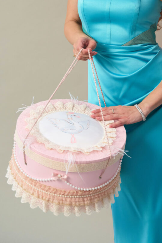 Cutie decorată handmade cu lebădă, perfectă pentru transportul hăinuțelor și accesoriilor de botez, elegantă și rafinată, perfectă pentru evenimente deosebite.