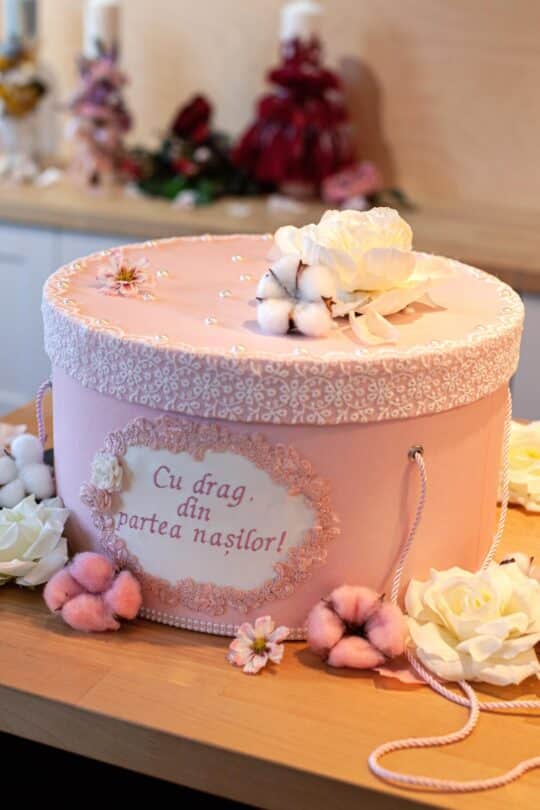 Cutie decorată handmade pentru hăinuțe și accesorii botez, cutie transport piese botez.