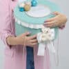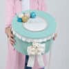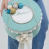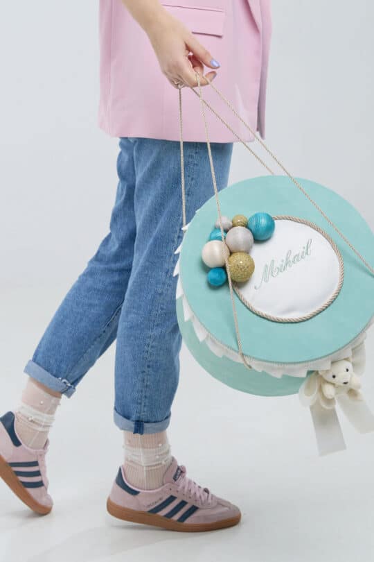 Cutie decorată cu baloane jucăușe și fundiță, perfectă pentru transportul hăinuțelor și accesoriilor de botez, elegantă și rafinată, perfectă pentru evenimente deosebite.